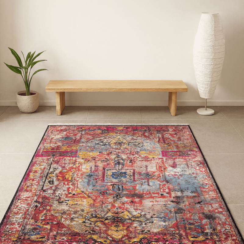 • 🔹 ساختار سه‌لایه — سطح مخملی چاپی + نمدِ چندلایهٔ ضخیم + پشت‌کارِ ضدلغزش؛ ایستایی عالی روی پارکت/سرامیک.