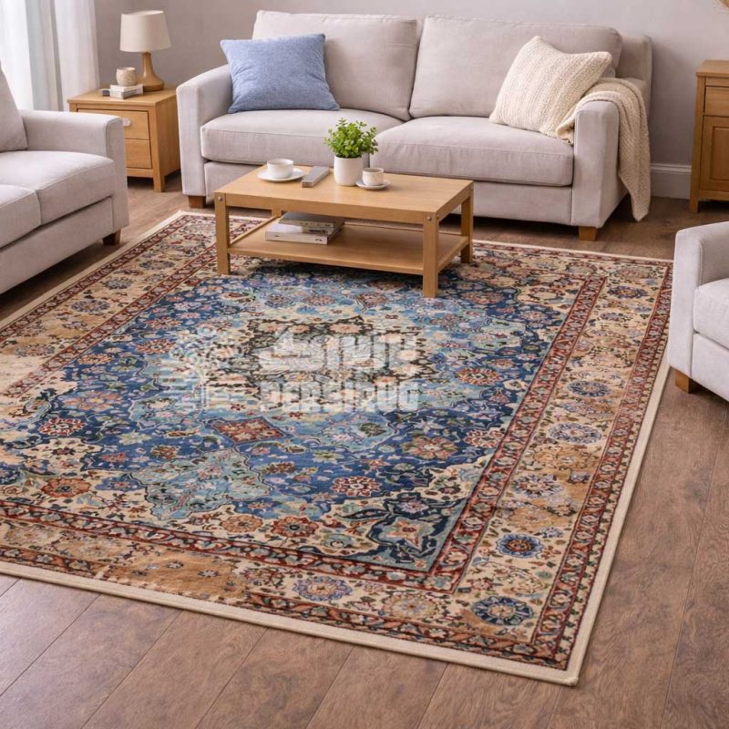 فرش ماشینی مدرن | فرش طرح پتینه | فرش زمینه آبی طلایی | فرش ساده